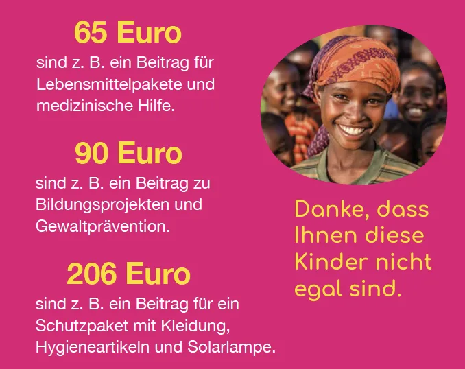Während viele Menschen in Deutschland sich auf ein ruhiges Weihnachtsfest vorbereiten, erleben Millionen Kinder in Afrika eine vollkommen andere Realität. 22 Millionen Kinder sind dort derzeit auf der Flucht – eine Zahl, die größer ist als die Bevölkerung Nordrhein-Westfalens. Sie fliehen vor Gewalt, Bürgerkriegen, Hunger oder Naturkatastrophen. Häufig bleibt ihnen nur das, was sie am Körper tragen.Der 9-jährige Omran musste mit seiner Familie aus seiner Heimat fliehen.Eines dieser Kinder ist der 9-jährige Omran, der gemeinsam mit seiner Familie aus seinem Heimatdorf fliehen musste. Weil er nicht laufen konnte, trug seine Mutter ihn auf dem Rücken. Auf der Flucht geriet die Familie in einen Hinterhalt, viele Menschen starben beim Versuch, einen überfluteten Fluss zu überqueren, und Omrans zwei Brüder wurden kurzzeitig von der Familie getrennt. Nach tagelangem Marsch fanden sie glücklicherweise wieder zusammen. Dass die drei heute in relativer Sicherheit leben, ist ein Glück, das längst nicht allen Kindern vergönnt ist. Für viele bedeutet Flucht nicht nur Unsicherheit, sondern auch akute Gefahr für Gesundheit, körperliche Unversehrtheit und Zukunftsperspektiven.Was Ihre Unterstützung bewirken kannGemeinsam mit unseren Mitgliedsorganisationen stehen wir unmittelbar an der Seite der Betroffenen und setzen umfassende Maßnahmen in besonders gefährdeten Regionen um. Drei Projekte zeigen exemplarisch, wie dringend Unterstützung gebraucht wird – und wie viel sie bewirken kann.Äthiopien (Region Tigray): Schutz, Stabilität und Bildung für vertriebene KinderIn der äthiopischen Tigray-Region leben Hunderttausende Kinder auf der Flucht vor Konflikten, Gewalt und wiederkehrenden Dürren. Viele von ihnen haben keinen Zugang zu Nahrung, Bildung oder Gesundheitsversorgung und sind stark gefährdet, Opfer von Ausbeutung, Missbrauch oder früher Verheiratung zu werden. Besonders Kinder ohne Angehörige geraten schnell in Situationen, die ihre Sicherheit und Zukunft massiv bedrohen.ChildFund unterstützt in den Gemeinden Wukro und Adigrat mehr als 11.000 vertriebene Kinder und Jugendliche. Das Projekt verbessert ihren Schutz durch Trainings zu Kinderschutz und Ernährung, psychosoziale Unterstützung sowie Lebensmittel- und Hygienepakete. Familien werden dabei begleitet, ihre Kinder zu schützen und eine stabile Existenz aufzubauen. Gleichzeitig werden lokale Schutzstrukturen gestärkt, damit Kinder langfristig in einem sicheren Umfeld aufwachsen können.Tschad: Medizinische Versorgung und therapeutische BegleitungIm Tschad leben viele Menschen in extremer Armut – besonders Menschen mit Behinderungen sind stark gefährdet, da sie oftmals keinen Zugang zu grundlegender Versorgung oder Schutzstrukturen haben. Die Lage wird zusätzlich verschärft durch Konflikte in den Nachbarländern, Klimawandel und große Fluchtbewegungen aus Sudan, der Zentralafrikanischen Republik und Nigeria. Vor allem in der Region Lac geraten Vertriebene und aufnehmende Gemeinden gleichermaßen unter Druck, während die Lebensbedingungen weiter instabil bleiben.Handicap International unterstützt dort vertriebene Kinder und ihre Familien durch Rehabilitationsangebote, psychosoziale Betreuung, inklusive Bildungsmaßnahmen und Aufklärung über Gefahren im Umfeld. Gleichzeitig stärkt die Organisation soziale Strukturen vor Ort, fördert Konfliktbewältigung und soziale Teilhabe und verbessert die Versorgung durch logistische Unterstützung für andere Hilfsorganisationen. Für viele geflüchtete Kinder bedeutet diese Arbeit eine Chance auf Schutz, Stabilität und einen menschenwürdigen Alltag.Mali und Burkina Faso: Versorgung in akuten KrisensituationenIn der Sahelzone unterstützt ADRA Gemeinden in Burkina Faso und Mali dabei, akute Not zu lindern und langfristig widerstandsfähiger zu werden. Familien, die vor Konflikten, Terror oder Dürren fliehen mussten, erhalten Lebensmittelpakete, Notfallnahrung für Kinder sowie finanzielle Soforthilfe.Die Menschen in beiden Ländern sind seit Jahren von einer komplexen Krise betroffen: Anhaltende Dürren und Ernteausfälle treffen auf eine schnelle Bevölkerungszunahme und einen wachsenden Mangel an Acker- und Weideflächen. Gleichzeitig verschärfen bewaffnete Gruppen die Lage, sodass ganze Regionen unsicher geworden sind und Millionen Menschen ihr Zuhause verlassen mussten. Viele suchen Schutz in ländlichen Gemeinden, die selbst unter Wasserknappheit und Hunger leiden. Diese Kombination aus Klimastress, Armut und Gewalt zählt zu den Haupttreibern der Flucht in Burkina Faso und Mali – genau hier setzt ADRAs Unterstützung an.Was eine Spende bewirken kannIn einer Zeit, die für viele Menschen von Licht und Hoffnung geprägt ist, können solche Beiträge für ein Kind auf der Flucht den entscheidenden Unterschied machen.Gemeinsam schaffen wir so Sicherheit, Stabilität und neue Perspektiven für Kinder, die unverschuldet in eine lebensbedrohliche Situation geraten sind.Jetzt Beitrag leisten und Engagement stärken!