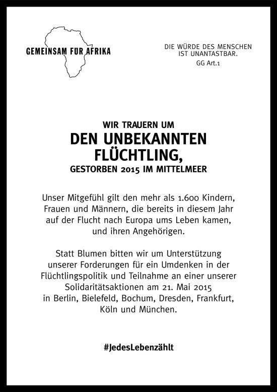 Der Countdown läuft! Nun sind es nur noch wenige Stunden bis zum Start unserer deutschlandweiten Solidaritätsaktionen mit den Menschen, die aufgrund gewaltsamer Konflikte, politischer Verfolgung aber auch Armut und Hunger gezwungen sind, ihre Heimat zu verlassen. Morgen gehen wir auf die Straße, da wir uns nicht damit abfinden können, dass das Mittelmeer ein Massengrab für Flüchtlinge bleibt. Wir protestieren für ein Umdenken in der europäischen Flüchtlingspolitik und fordern neben einer umfassenden europäischen Seenotrettung, dass die Ursachen von Flucht erkannt, ernstgenommen und bekämpft werden. Schließen Sie sich uns an! Besuchen Sie unsere Aktionen von 12 Uhr bis 13 Uhr in Berlin am Platz des 18. März, Bielefeld am Jahnplatz, Bochum am Dr. Ruer-Platz, Dresden am Neumarkt, Frankfurt am Main vor der Hauptwache, Köln am Bahnhofsvorplatz, München am Marienplatz. Gedenken Sie mit uns den 23.700 verstorbenen Flüchtlingen, die seit dem Jahr 2000 im Mittelmeer ihr Leben lassen mussten, und fordern Sie gemeinsam mit uns, dass sich etwas ändern muss! Denn #JedesLebenzählt! Wir brauchen auch online Ihre Unterstützung. Besuchen Sie unsere Kampagnenwebsite #JedesLebenzählt und setzen Sie sich mit einem Klick für unsere Forderungen an die Bundesregierung für eine humanere Flüchtlings- und Entwicklungspolitik ein. Vielen Dank!