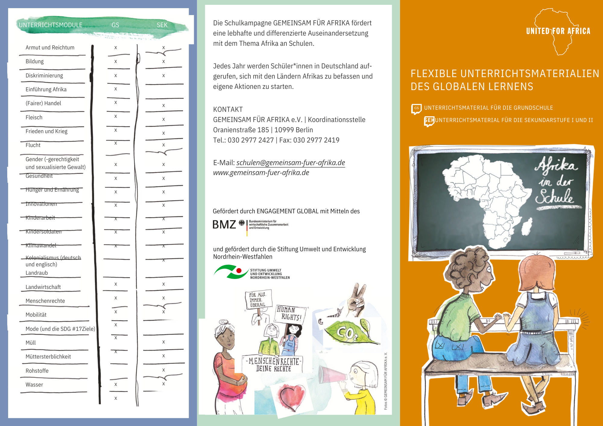 Flyer Afrika in der Schule Shop· Poster und Flyer·Unsere Afrika-Spiele, Poster und Flyer Informationen zur Ausleihe Kosten: kostenfrei Transportkosten: wir übernehmen das Porto Informieren Sie sich und andere über das Angebot von Gemeinsam mit Afrika. Bestellen Sie hier kostenlos Informationsflyer. Flyer Afrika in der Schule Menge Wählen Sie die Menge: Zum Bestellen anmelden Artikelnummer: 1111 Kategorien: Poster und Flyer, Unsere Afrika-Spiele, Poster und Flyer Beschreibung Zum Versand des Flyers Beschreibung Der Flyer zu den Unterrichsmodulen „Afrika in der Schule“ beinhaltet alle wichtigen Informationen zu unserem Angebot. Er eignet sich gut, um an der Schule oder in der Öffentlichkeit über unsere Schulmaterialien und das eigene Projekt zu informieren und eine Auseinandersetzung mit Afrika anzuregen. Bitte geben Sie bei Ihrer Bestellung die gewünschte Menge an Flyern an. Zum Versand des FlyersWir versenden die Flyer per Post innerhalb einer Woche nach Ihrer Bestellung. Das Porto übernehmen wir. Wir verschicken eine maximal Anzahl von 50 Flyer.