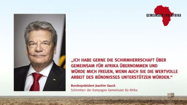 Bundespräsident Joachim Gauck über GEMEINSAM MIT AFRIKA: „Jeder ist seines Glückes Schmied, aber wann und wo wir auf diese Welt kommen wird auf einem anderen Amboss entschieden. Geburtsort und Geburtszeit haben aber sehr viel damit zu tun, welche Chancen Menschen im Leben haben. Stellen Sie sich nur einmal vor, wie es ist, in einen Bürgerkrieg in Afrika geboren zu werden. GEMEINSAM MIT AFRIKA setzt sich dafür ein, dass Menschen in Afrika ihre Potenziale voll nutzen können. Das Bündnis von Hilfsorganisationen verbessert zusammen mit seinen Partnern in Afrika in tausenden Projekten die Lebensbedingungen der Menschen. In Deutschland fördert und fordert GEMEINSAM MIT AFRIKA neue Blickwinkel und differenzierte Sichtweisen auf unseren Nachbarkontinent. Das Schicksal von Afrika wird auch in Europa mitbestimmt. Damit trägt GEMEINSAM MIT AFRIKA zu mehr Chancengleichheit und besseren Entwicklungsperspektiven bei. Ich habe daher gerne die Schirmherrschaft über GEMEINSAM MIT AFRIKA übernommen und würde mich freuen, wenn auch Sie die wertvolle Arbeit des Bündnisses unterstützen würden.“ (Bundespräsident Joachim Gauck, Schirmherr der Kampagne GEMEINSAM MIT AFRIKA)