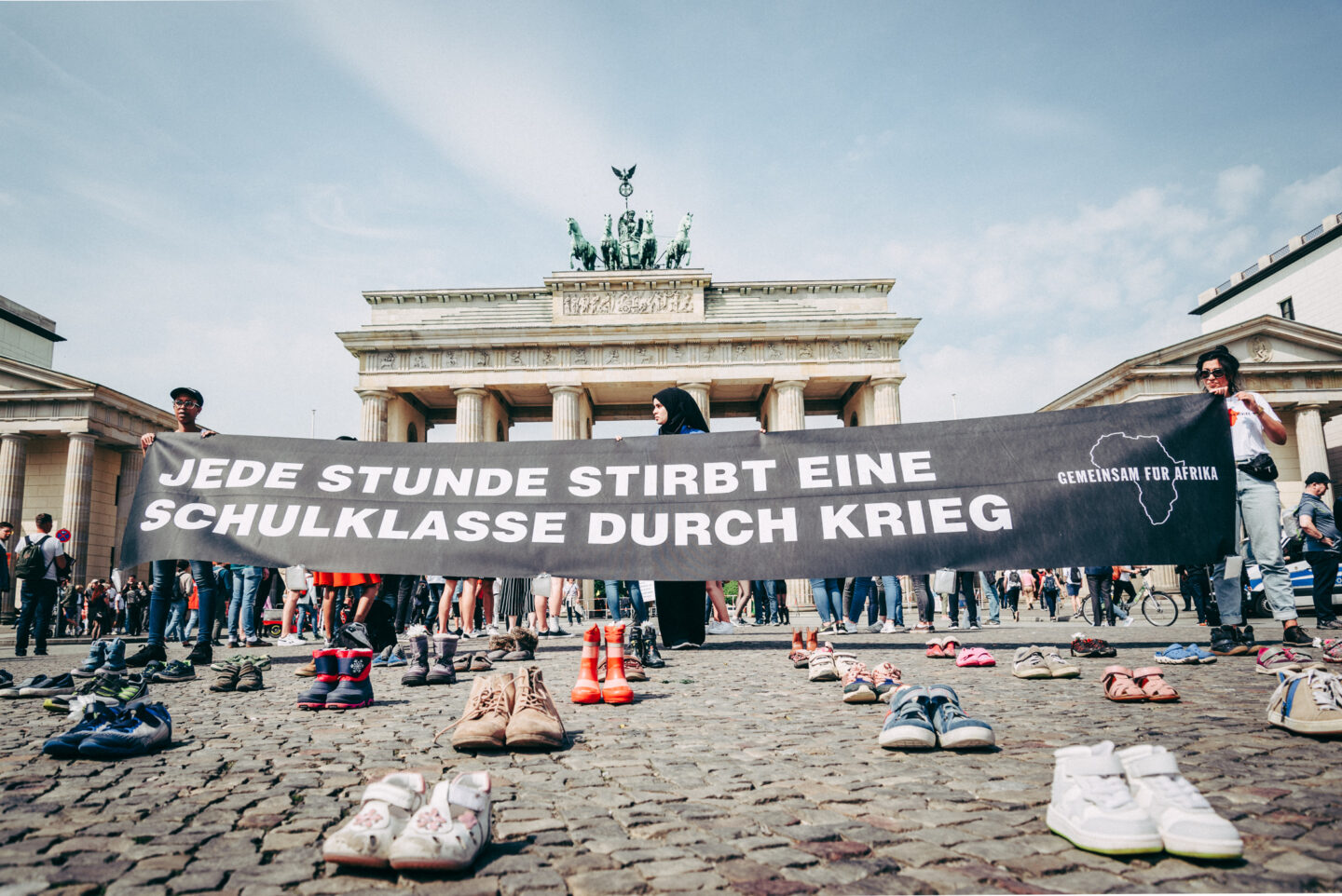 Im Vorfeld des Internationalen Afrikatages ging GEMEINSAM MIT AFRIKA mal wieder auf die Straße. Im Zentrum unserer bundesweiten Aktion stand im Jahr 2019 das oft vergessene Schicksal von Millionen von Mädchen und Jungen, die täglich Hass, Gewalt, Unsicherheit und den Tod hautnah erleben. Denn die Kriege und bewaffneten Konflikte in afrikanischen Staaten geraten in der breiten Öffentlichkeit oft in Vergessenheit. Das wollten wir ändern! Am 24. Mai haben wir Hunderte verlassene Kinderschuhe auf zentralen Plätzen in Berlin, Frankfurt/Main, Köln, Hamburg, München, Stuttgart und Leipzig aufgestellt. Sie standen symbolische für hunderte Kinder, die in Kriegen und bewaffneten Konflikten ihr Leben lassen müssen. Mit dieser Demonstration erinnerte das Bündnis GEMEINSAM MIT AFRIKA an das tägliche Sterben von Kindern im Krieg. Die Aktion fand um die Mittagszeit Uhr in folgenden Städten statt: Berlin – Pariser Platz am Brandenburger Tor Köln – Roncalliplatz am Kölner Dom Hamburg – Flaggenplatz am Jungfernstieg Leipzig – Augustusplatz München – Max-Joseph-Platz Frankfurt am Main – An der Hauptwache Stuttgart – Schlossplatz Unser Video zur Aktion: [av_video src='https://youtu.be/XpnJeLHMI70' mobile_image='' attachment='' attachment_size='' format='16-9' width='16' height='9' conditional_play='' av_uid='av-20np1u' custom_class=''] [av_video src='' mobile_image='' format='16:9' width='16' height='9' conditional_play='' av-desktop-hide='' av-medium-hide='' av-small-hide='' av-mini-hide='' av_uid='']