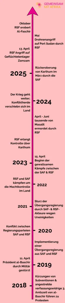 „Im Sudan spielt sich derzeit eine der schlimmsten humanitären Krisen weltweit ab“ (UNHCR).Sudan © wikimedia commons/Canva/Gemeinsam mit AfrikaAm 15. April 2023 brach ein Konflikt zwischen den sudanesischen Streitkräften (SAF) und den Rapid Support Forces (RSF) aus, der schnell in einem bis heute anhaltenden Bürgerkrieg mündete. Beiden Parteien wird vorgeworfen das internationale humanitäre Recht zu missachten und massive Menschenrechtsverletzungen gegen die Zivilbevölkerung zu begehen. Trotz der enormen Präsenz der Kriegsparteien, besonders der RSF, in den Sozialen Medien, bleibt eine konstante Berichterstattung, die Bereitstellung von ausreichenden Hilfsgütern und der Einsatz für die Beendigung des Krieges aus.Wie ist es zum Bürgerkrieg gekommen und wer sind die Akteure?Der Krieg im Sudan findet hauptsächlich zwischen zwei Parteien statt. Auf der einen Seite stehen die Sudanese Armed Forces (SAF), die ursprünglich reguläre Armee des Landes. Angeführt von Abdel Fattah Al Burhan, kontrolliert sie den Norden und Osten des Landes mit Port Sudan als Hauptstadt. Auf der anderen Seite stehen die Rapid Support Forces (RSF), angeführt von Mohammed Hamdan Daglo, die von Darfur aus operiert. Die 2013 gegründete RSF ist keine reguläre, einheitliche Armee, sondern eine paramilitärische Gruppe. Gegründet wurde die RSF von dem ehemaligen Präsidenten al-Baschir (1989-2019), um seine Macht zu sichern und gegen Aufstände vorzugehen.Am 11. April 2019 wurde al-Baschir durch das Militär aufgrund anhaltender Proteste der Bevölkerung u.a. wegen hoher Inflation und starker Misswirtschaft sowie einer von ihm angestrebten verfassungswidrigen dritten Amtszeit gestürzt. Daraufhin übernahmen sowohl Akteure der SAF als auch der RSF Positionen in der Übergangsregierung des Sudans. Doch Machtkämpfe um politischen Einfluss zwischen Burhan und Daglo führten am 15. April 2023 zum Beginn des Krieges.Durch ihr Handeln tragen beide Kriegsparteien zur Zerstörung und Spaltung des Landes bei, missachten humanitäres Recht und begehen Menschenrechtsverletzungen an der Zivilbevölkerung.Folgen für die ZivilbevölkerungDie Zivilbevölkerung bleibt vom Krieg nicht verschont. Der Alltag der Menschen ist geprägt von Gewalt, Angst und Vertreibung. Angriffe, sexualisierte Gewalt und Massaker sind üblich, besonders gefährdet sind Frauen und Mädchen.Schätzungsweise über 150.000 Menschen sind seit 2023 bereits getötet worden. Von den 52 Millionen Einwohner*innen des Sudan sind etwa 21 Millionen von akuter Ernährungsunsicherheit betroffen. Mehr als 30 Millionen Menschen sind auf humanitäre Hilfe angewiesen, darunter 16 Millionen Kinder. 13 Millionen Menschen mussten in andere Regionen des Landes oder Nachbarländer fliehen. Die bereitgestellten Geflüchtetenunterkünfte sind überfüllt und die mangelnde Versorgung und Infrastruktur führt auch dort zu lebensgefährlichen Bedingungen.Zudem kommt es zu ethnisch motivierten Angriffen, wie das von der mehrheitlich arabischen RSF verübte Massaker an den Masalit 2023, die Teil der nicht-arabischen Bevölkerung sind.Darüber hinaus ist das Gesundheitssystem zusammengebrochen, viele Einrichtungen wurden zerstört. 75 Prozent der Notfallstationen für die Bereitstellung von Lebensmitteln und die Sicherung von medizinischer Versorgung mussten ebenfalls aus Mangel an Ressourcen schließen. Gleichermaßen wurde ein Großteil der Infrastruktur und der landwirtschaftlichen Flächen des Landes zerstört.Internationale Akteure & wirtschaftliche ProfiteSowohl die RSF als auch die SAF waren ursprünglich schwache militärische Akteure ohne breite Basis. Die Ausmaße und die Auswirkungen des Krieges für die Bevölkerung und das Land sind ausschlaggebend beeinflusst durch ausländisches Mitwirken. Gold, Erdöl und Agrarprodukte, sowie strategische Interessen, aufgrund der geografischen Lage des Sudans am Roten Meer, sind Interessen der internationalen Akteure. Im Tausch von Rohstoffen, Kontrolle über fruchtbares Ackerland und politische Einflussnahme auf den Sudan werden die beiden Kriegsparteien mit Waffen und Geld versorgt.Die SAF wird von dem langjährig verbündeten Ägypten unterstützt, sowie vom Iran, der Türkei, Saudi-Arabien und Katar. Waffen aus Russland und China werden beispielsweise aus Katar geliefert. Für die RSF stellen die Vereinigten Arabischen Emirate (VAE), durch vergangene gemeinsame Militäroperationen, den bedeutendsten Verbündeten dar. Russland soll ebenfalls Waffen an die RSF geliefert haben und ist damit in Kontakt mit beiden Kriegsparteien.Der Anstieg der Rohstofflieferungen zeigt, dass die internationalen Akteure enorm von dem Krieg profitieren. Sowohl wirtschaftlich als auch politisch scheint der Krieg für sie von Vorteil:„Für diejenigen, die die Konfliktparteien im Sudan mit Waffen beliefern, kann ein Krieg ebenso lukrativ sein wie Frieden, zumal sich ein zersplitterter und zerrissener Sudan leichter beeinflussen lässt.“ (Joshua Craze)Die Rolle der EU und Deutschlands im SudankriegDie EU und Deutschland beteiligen sich bisher nicht aktiv an dem Krieg, haben jedoch passiv zu der Entwicklung beigetragen. Zum einen wurde die RSF 2015 mit Geldern und Ausrüstung für Grenzschutzprogramme im Westen des Sudans, der Einsatzregion der RSF, direkt gestärkt, um Migration nach Europa abzuwehren. Dies verschaffte der RSF Einfluss und Ressourcen. Zum anderen wurde festgestellt, dass die RSF auch aktuell mit Rüstungsgütern aus Deutschland arbeitet. Auf Videos und Bilder in den Sozialen Medien konnten Gewehre aus Deutschland identifiziert werden. Wie die Waffen in den Sudan gelangen konnten, ist ungeklärt. Offiziell besteht seit 1994 ein EU-Embargo für Waffenlieferungen an den Sudan. Die Lieferung über andere Länder ist ebenfalls verboten. Weiterhin wurden Verteidigungssysteme und Elemente aus England, Frankreich und Bulgarien gesichtet.Die aktuelle Lage Ende 2025 & AusblickÜber ein Jahr hat die RSF Al-Faschir, die Hauptstadt d
