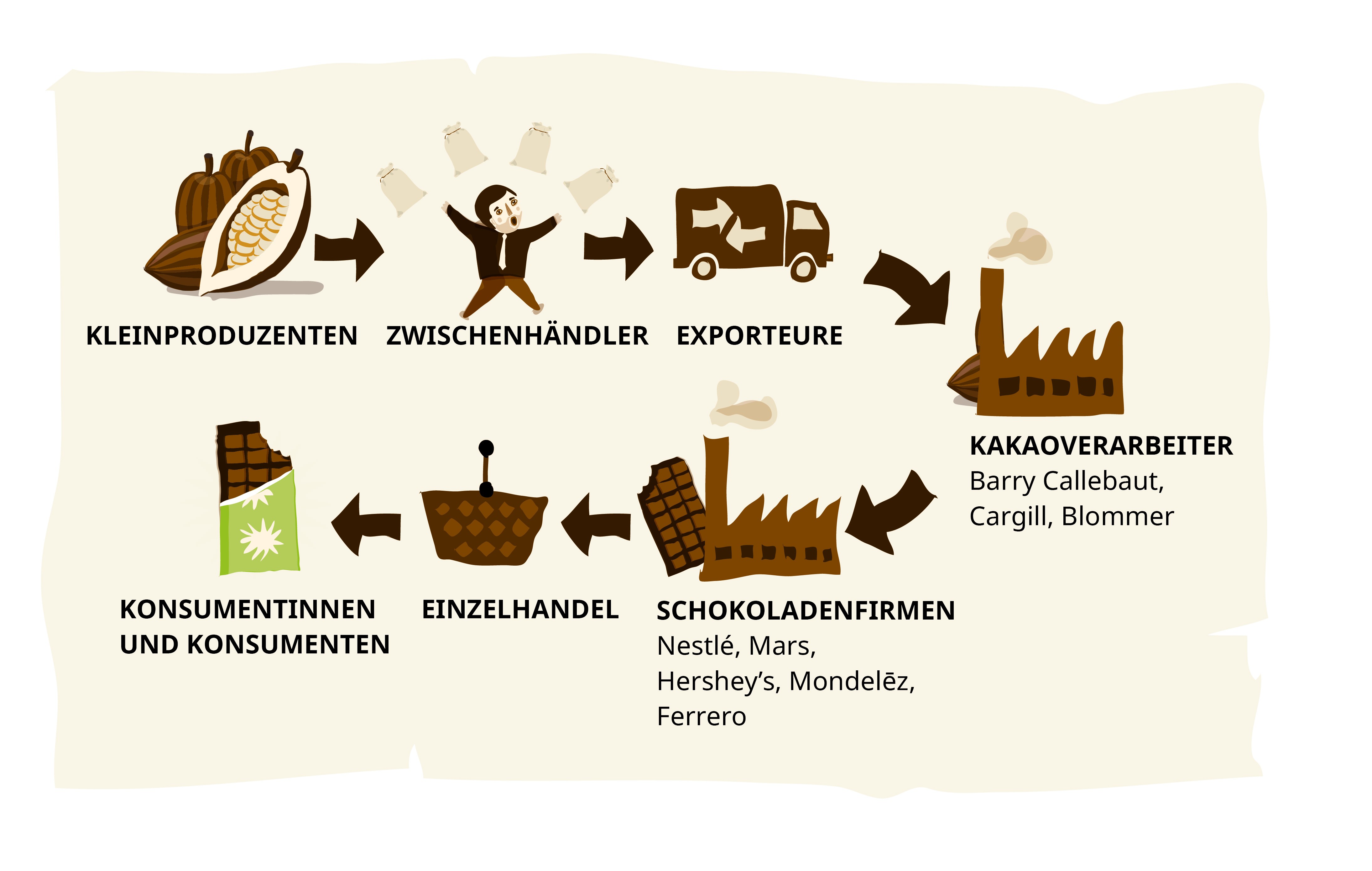 Von der Kakaoplantage in z.B. Ghana bis in den Supermarkt in Deutschland ist es ein weiter Weg. Beim Transport, der Verarbeitung und dem Verkauf sind viele Akteure involviert.
